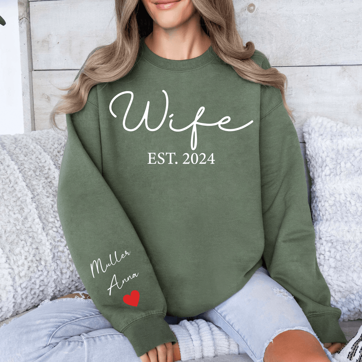 Feiern Sie Ihre gemeinsame Geschichte mit unserem anpassbaren 'Wife' Sweatshirt. Verewigen Sie Ihr besonderes Jahr auf der Brust und die Namen des Paares auf den Ärmeln. Ein ideales Geschenk für Jahrestage, den Valentinstag oder einfach, um die Liebe täglich zu feiern. Dieses bedruckte Sweatshirt ist ein modisches Zeugnis Ihrer gemeinsamen Erinnerungen und Zukunft.